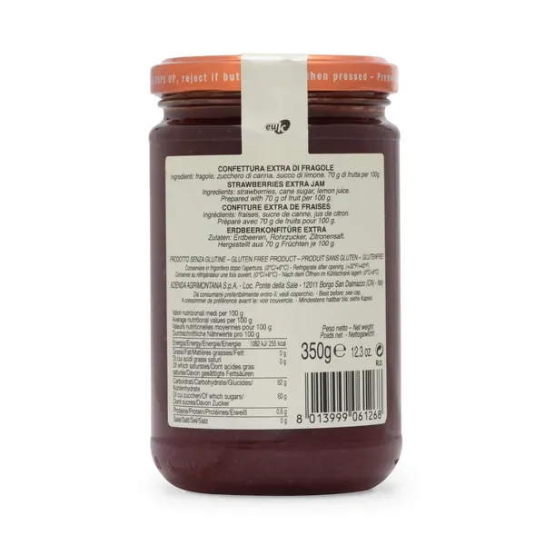 La Confettura Extra di Fragole Agrimontana si distingue per l’altissima percentuale di frutta utilizzata e per l’assenza totale di coloranti, conservanti o aromi artificiali. Ogni vasetto è un concentrato di sapore: la dolcezza naturale delle fragole è bilanciata solo da un pizzico di zucchero di canna e succo di limone. La presenza di pezzi di frutta intera testimonia la delicatezza della lavorazione artigianale, pensata per mantenere intatta la struttura e l’aroma del frutto.