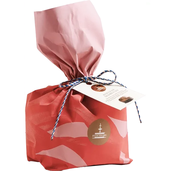 Panettone Fiasconaro con freschi canditi d’arancia e uvetta aromatizzata al “vino Marsala DOP” e “Terre Siciliane Zibibbo liquoroso IGP”, confezionato a mano.