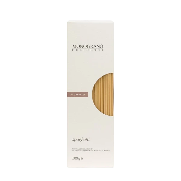 Il “Senatore” della pasta italiana. Gli Spaghetti Monograno Felicetti varietà Cappelli nascono nel cuore delle Dolomiti, unendo l’acqua purissima di sorgente a un grano antico dal carattere deciso e aristocratico. Una pasta dalla consistenza perfetta e dal profumo di fieno e pane cotto a legna, dedicata ai veri cultori del gusto